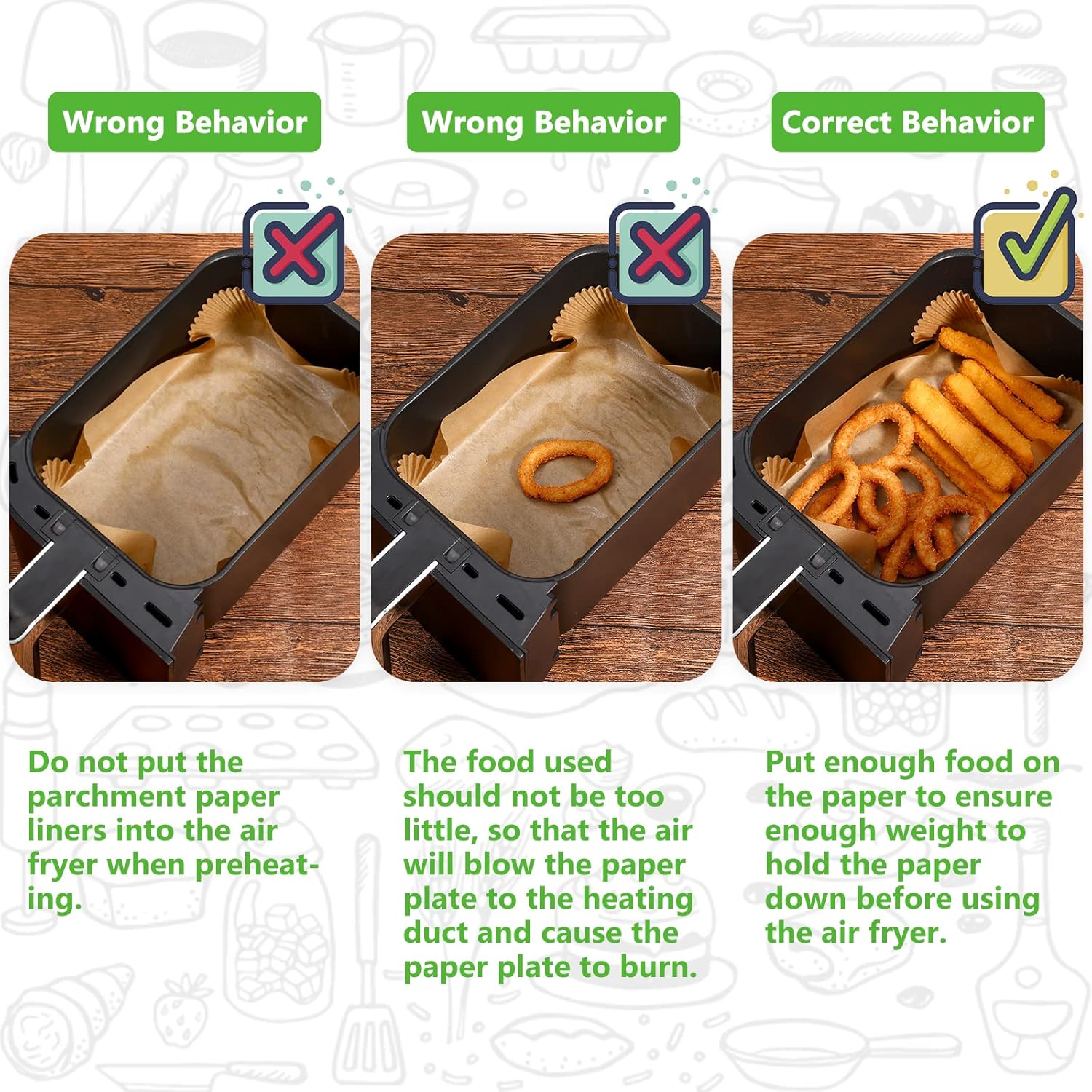 - ⚠️【Cautions】 Do not put empty parchment paper liners when preheating, and do not use too little food to avoid disposable paper liners that cannot be pressed because of their light weight, and hot air blowing the paper liners into the heat pipe causing the paper pan to burn.