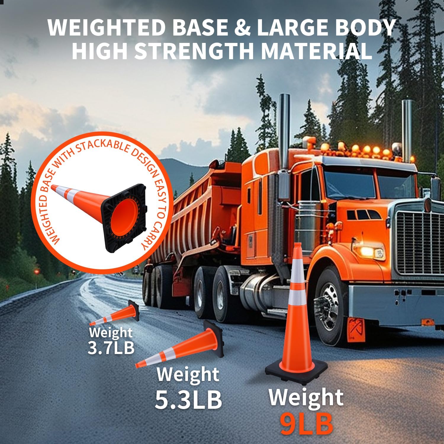 - Design: Heavy duty base cones have stable structure, wind-proof design, better safety and convenient operation. And our weighted safety cones stay up right without falling in wind, applicable to the barriers and roadblocks
