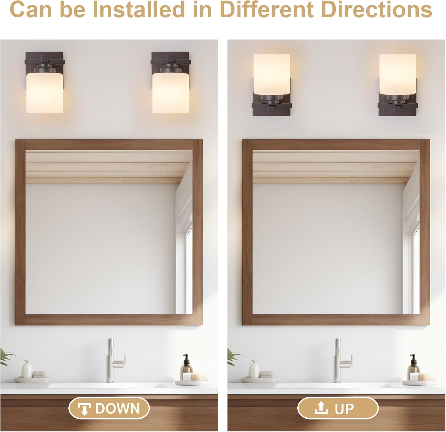 - 【Easy to Install】Vanity wall sconces are lights that are mounted to your wall. Vanity lights for bathroom can be installed in an upwards or downwards position. It's equipped with all the mounting hardware required for install. You can easily install it by referring to the user manual, only takes you a few minutes to finish.