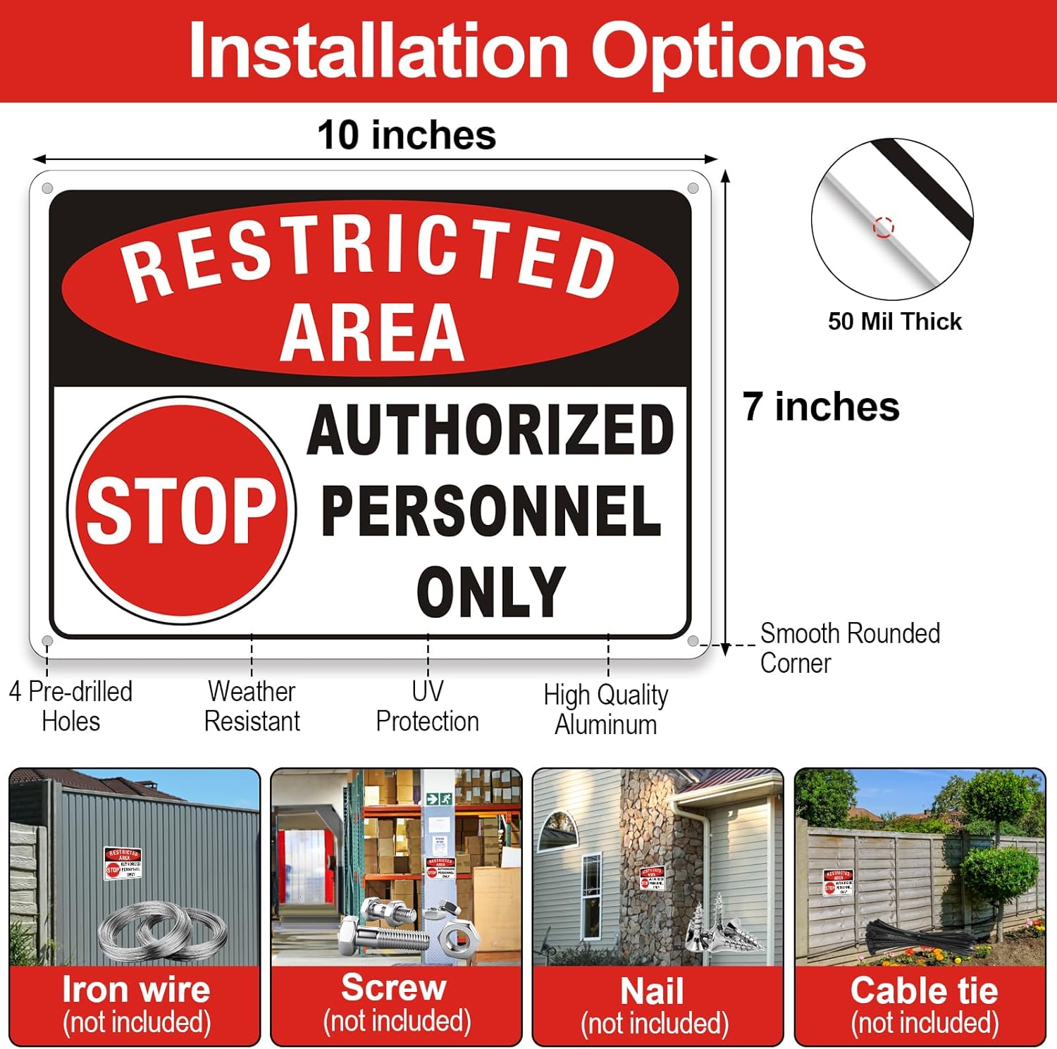 - 5.Easy to Install: Our restricted area do not enter sign are extremely easy to install with four holes, making the restricted area easy to install and ensuring the authorized personnel only sign stay securely in place without easily falling off. You can use nails, cable ties or rope to install, easy to operate.