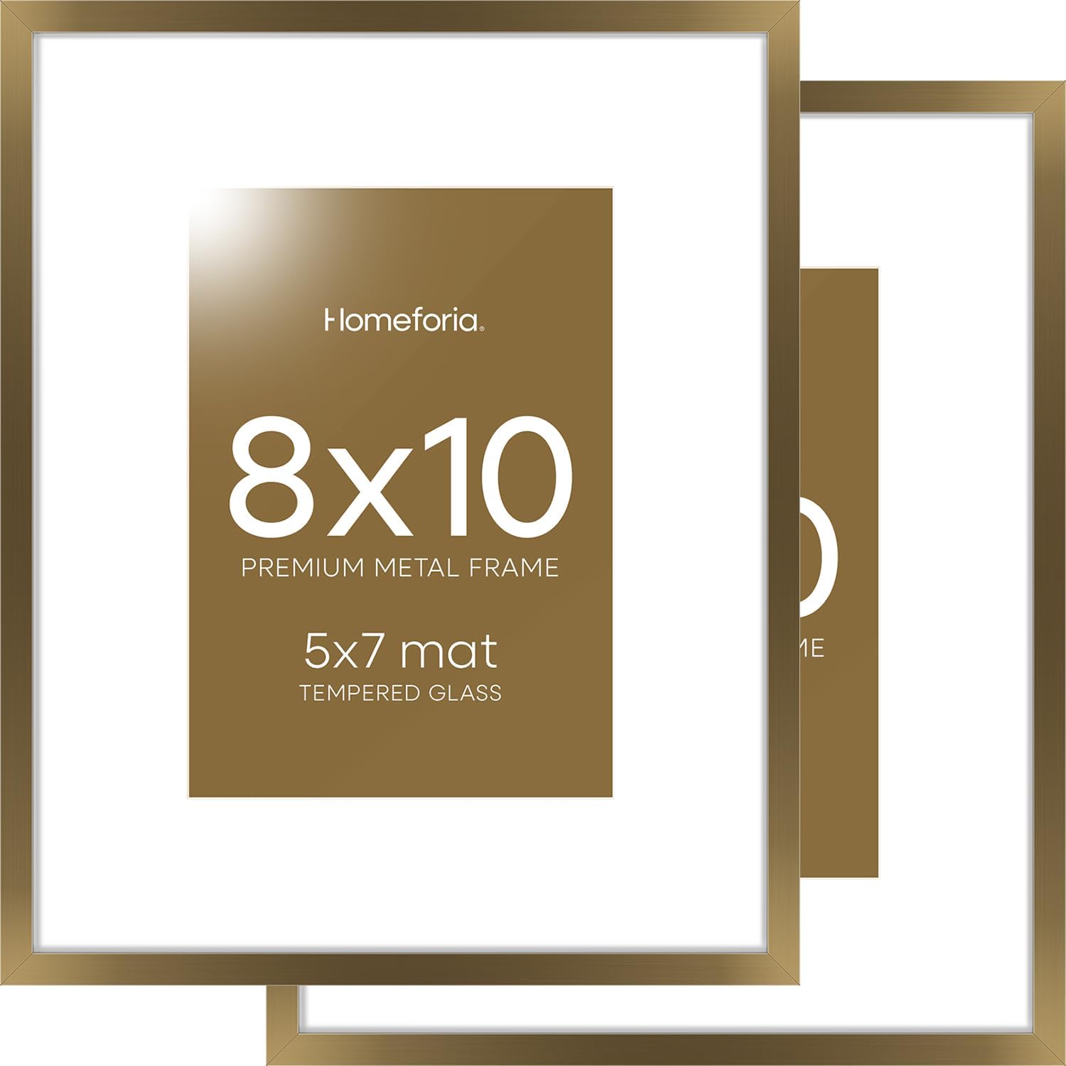 Homeforia Bronze Picture Frames 8x10, High End Metal 8 x 10 Photo Frame with Mat 5 x 7 Art, 10x8 Brass Frame Matted to 5x7 inch Print, 8by10 Wall or Tabletop Frames, Tempered Glass, Wall Kit, Set of 2